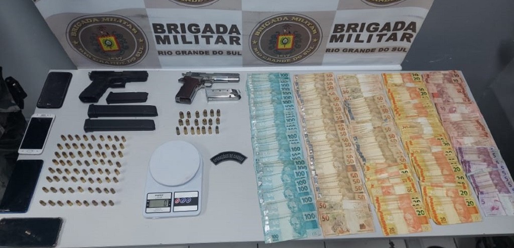 Com eles foram apreendidas uma pistola 9mm, dois carregadores e 59 munições do mesmo calibre, além de um revólver calibre 38, dez munições, um telefone celular e a quantia de R$ 80 em dinheiro. Foto: Divulgação/Papareia News