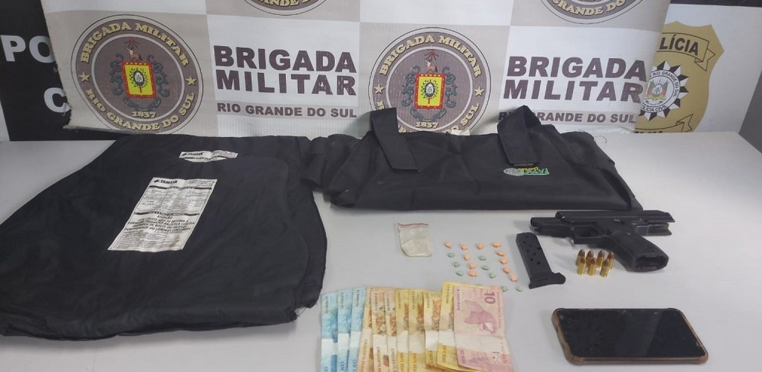 Na chegada, os brigadianos se depararam com um Ford Fusion, de cor prata, com um ocupante e fizeram a abordagem. Com ele foram localizadas uma pistola 9 mm, um carregador com sete munições, um pacote contendo 22 comprimidos de ecstase, um colete balístico, um telefone celular e a quantia de R$ 540 em dinheiro.