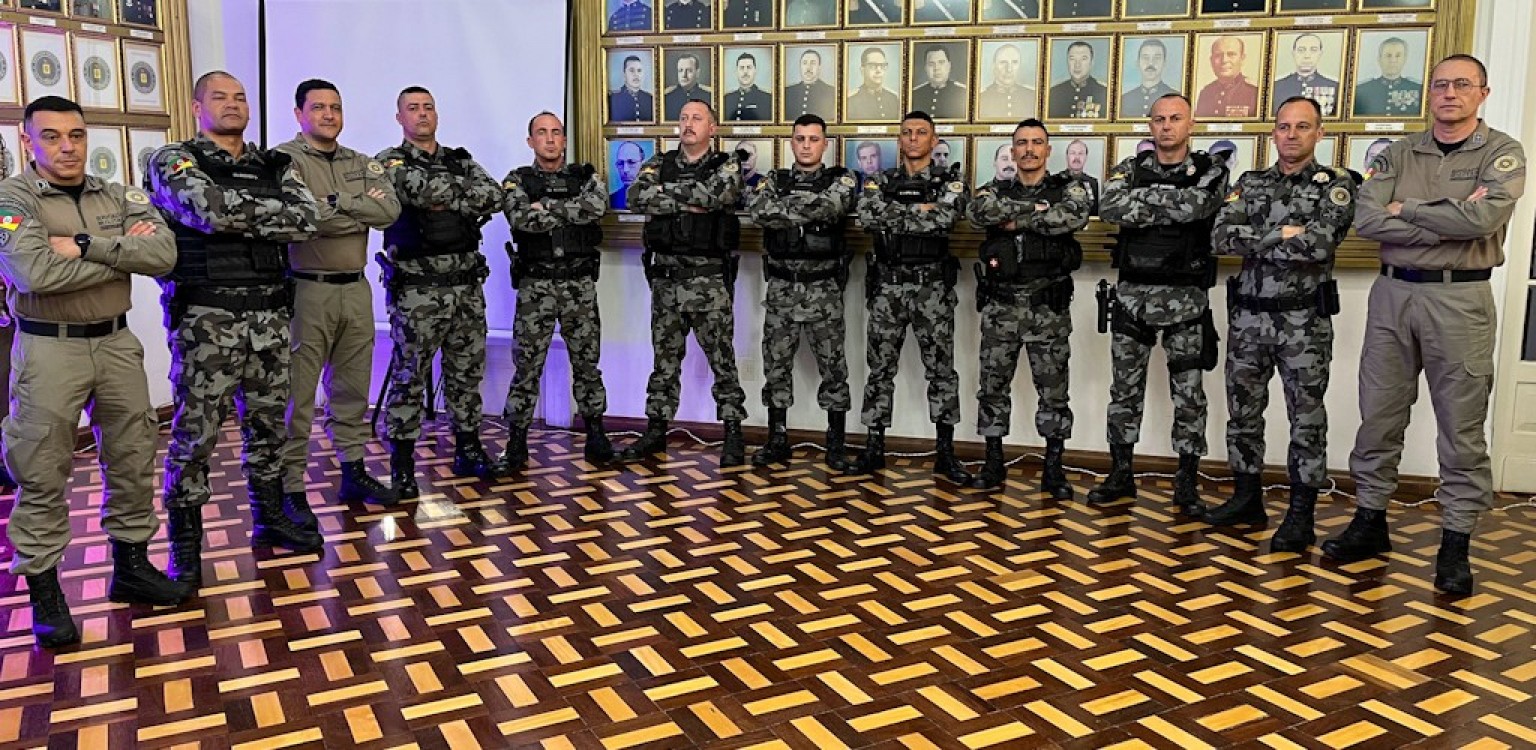 Também prestigaram a homenagem o subcomandante-geral, coronel Douglas da Rosa Soares, o chefe do estado-maior da Brigada Militar, coronel Luigi Gustavo Soares Pereira, o comandante do Comando de Polícia de Choque, coronel Cláudio de Azevedo Goggia, e o comandante do 5º BPChq, major Anderson Wenitt.