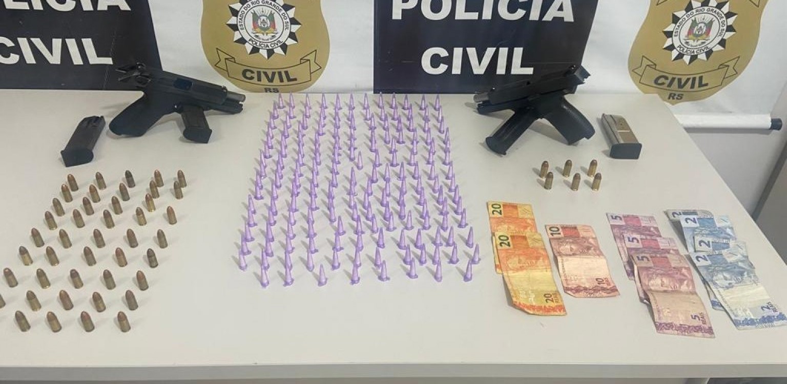 Conforme a Polícia Civil, foram apreendidas uma pistola 9mm, uma pistola .40, quatro carregadores de pistola, 44 munições de 9mm, seis munições calibre .40 e 172 pinos de cocaína. Além disso, foram realizados os bloqueios das contas bancárias dos alvos da operação, cujo número não foi divulgado.