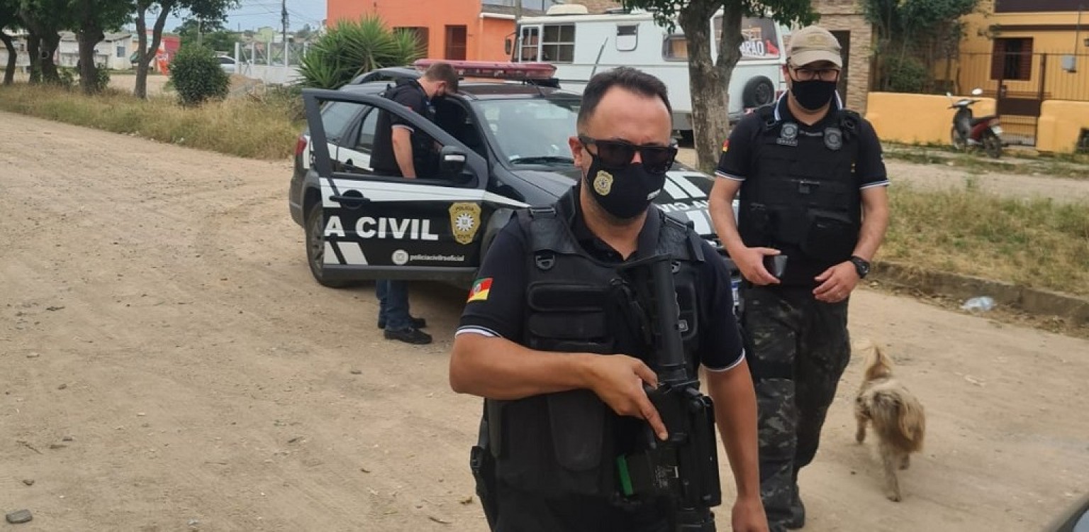A ação contou com a participação de 45 agentes da Polícia Civil de Jaguarão, Arroio Grande e Rio Grande, 12 policiais militares do 3º Batalhão de Policiamento de Área de Fronteira (BPAF) e brigadianos do Canil do 4º Batalhão de Políca Militar (BPM). Foto: Divulgação/PC