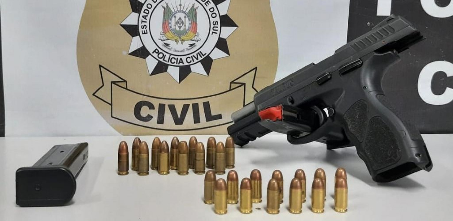 Com um dos investigados, os agentes localizaram uma pistola calibre 380 e pelo menos 25 munições. Foto: Divulgação/Polícia Civil