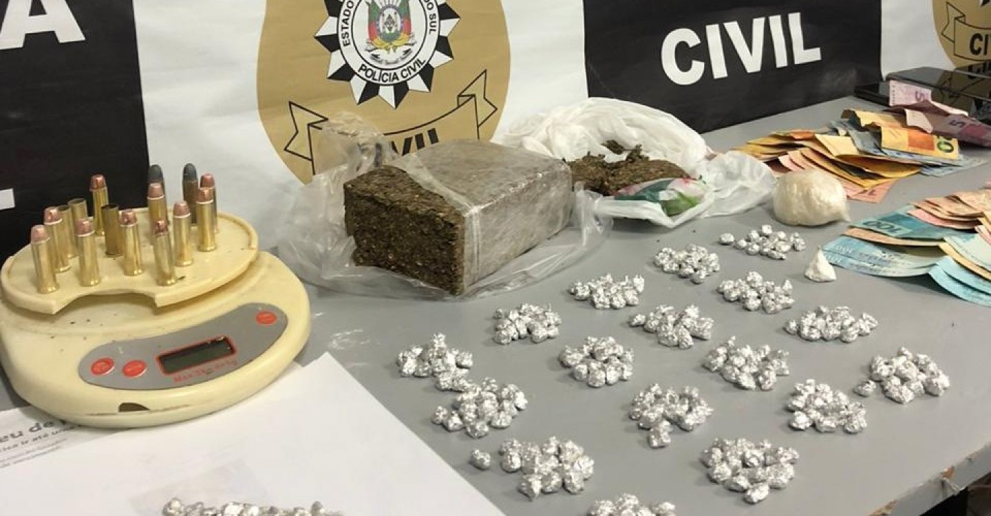 Com a dupla, foram localizadas 513 pedras de crack, meio quilo maconha, 39 gramas de cocaína, 12 munições calibre 38, uma balança de precisão e a quantia de R$ 1 mil em dinheiro. Ainda conforme a Polícia Civil, um dos presos possui antecedentes pelos crimes de porte de arma de fogo e receptação.