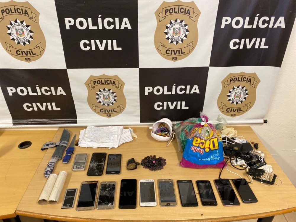 Na manhã desta sexta-feira (2), a Polícia Civil apreendeu drogas, aparelhos celulares, anotações de tráfico, balança de precisão e facas artesanais, no Presídio Estadual de Camaquã. Os objetos estavam em posse de um apenado, que foi preso em flagrante pelo crime.
