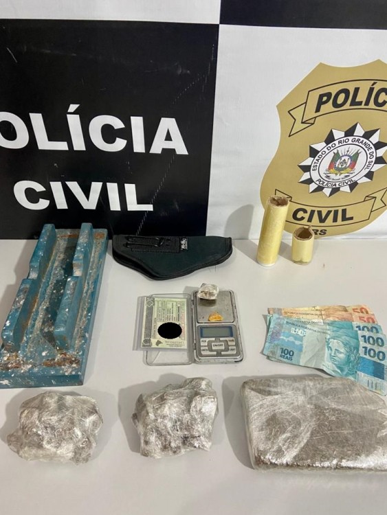 Além disso, os policiais apreenderam 440 gramas de maconha, porções de crack, duas balanças de precisão, uma prensa hidráulica avaliada em torno de oito mil reais, munições calibre .380, além da quantia de R$ 400,00 aparentemente em moeda falsa.