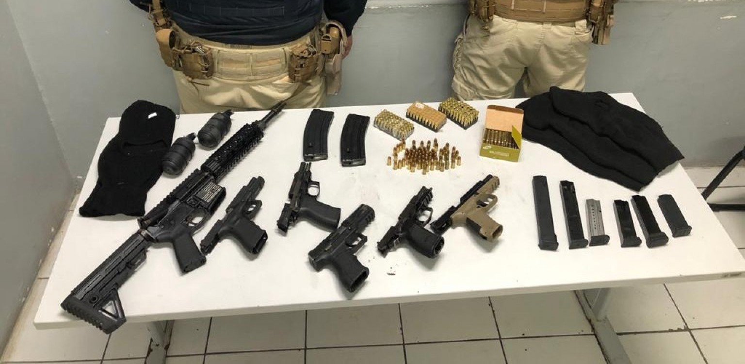 Durante a vistoria no interior do carro, foram encontrados escondidos em um compartimento no painel um fuzil 556, duas granadas, cinco pistolas 9mm, carregadores e uma vasta quantidade de munições. Policiais militares do 5º Batalhão de Polícia de Choque (BPChq) também auxiliaram na abordagem.