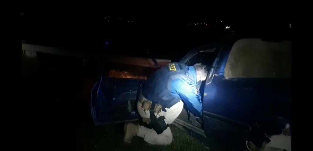 Durante o acompanhamento tático, os agentes perceberam que um pacote havia sido arremessado pela janela. A equipe continuou seguindo o automóvel até que conseguiu interceptá-lo alguns quilômetros à frente do ponto em que havia tentado realizar a abordagem.