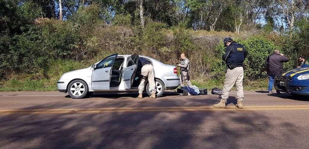O automóvel, um Jeep Renegade, foi abordado por uma equipe de patrulheiros que estava na rodovia. Depois de uma consulta ao sistema integrado e a verificação dos documentos, os agentes foram informados de que o carro estava na condição de roubo e rodando com placas clonadas.