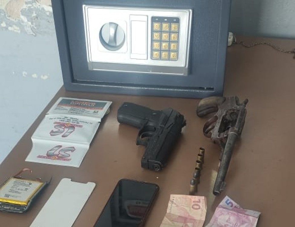 Durante a revista pessoal, foram localizadas uma pistola, um revólver calibre 38, um simulacro de arma de fogo, dinheiro, telefones celulares e o cofre subtraído da residência invadida por eles. Foto: Divulgação/BM