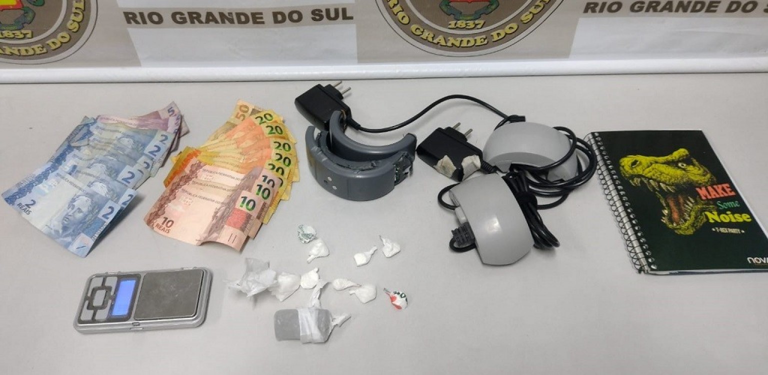 Ao avistar o trio, os brigadianos deram ordem de parada. Com eles foram localizadas porções de cocaína e maconha, uma balança de precisão e uma quantia em dinheiro que não teve o valor informado. Durante consulta ao sistema integrado, os policiais confirmaram que os dois homens eram foragidos do sistema prisional.