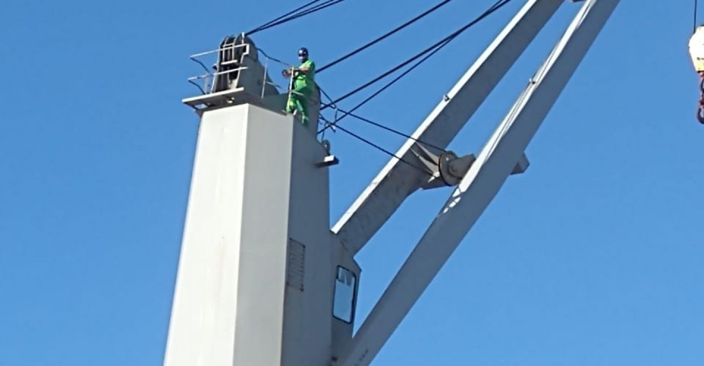 EM SINAL DE PROTESTO, SINDICALISTA SOBE EM GUINDASTE DE NAVIO NO PORTO
