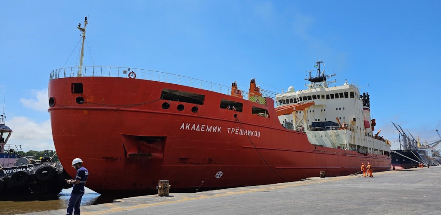 Para enfrentar as condições climáticas extremas da região e colocar em prática os estudos desejados, os pesquisadores utilizarão o navio Akademik Tryoshnikov. Foto: Divulgação/Portos RS