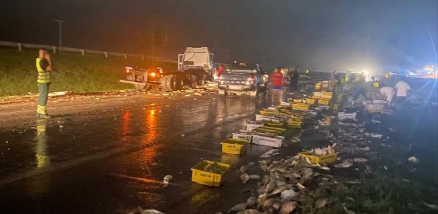 A carga de peixe que estava no caminhão acabou ficando espalhada sobre a pista. Foto: Divulgação/O Rio Grande Notícias Oficial