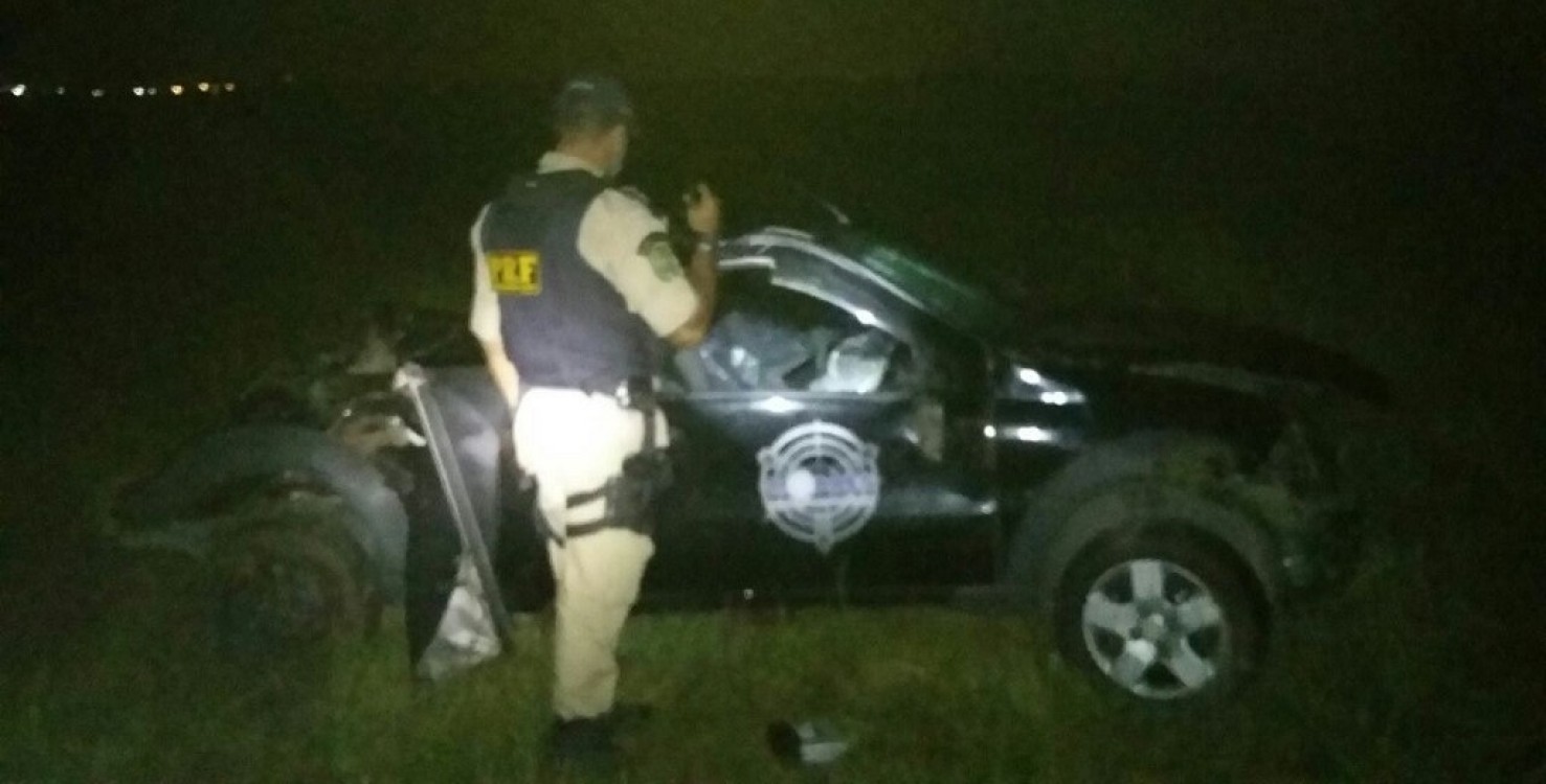 O excesso de velocidade pode ter sido a principal causa do acidente, pois a Fiat Strada rodou por cerca de 125 metros e boa parte desse percurso aconteceu sobre a rodovia (Divulgação PRF)