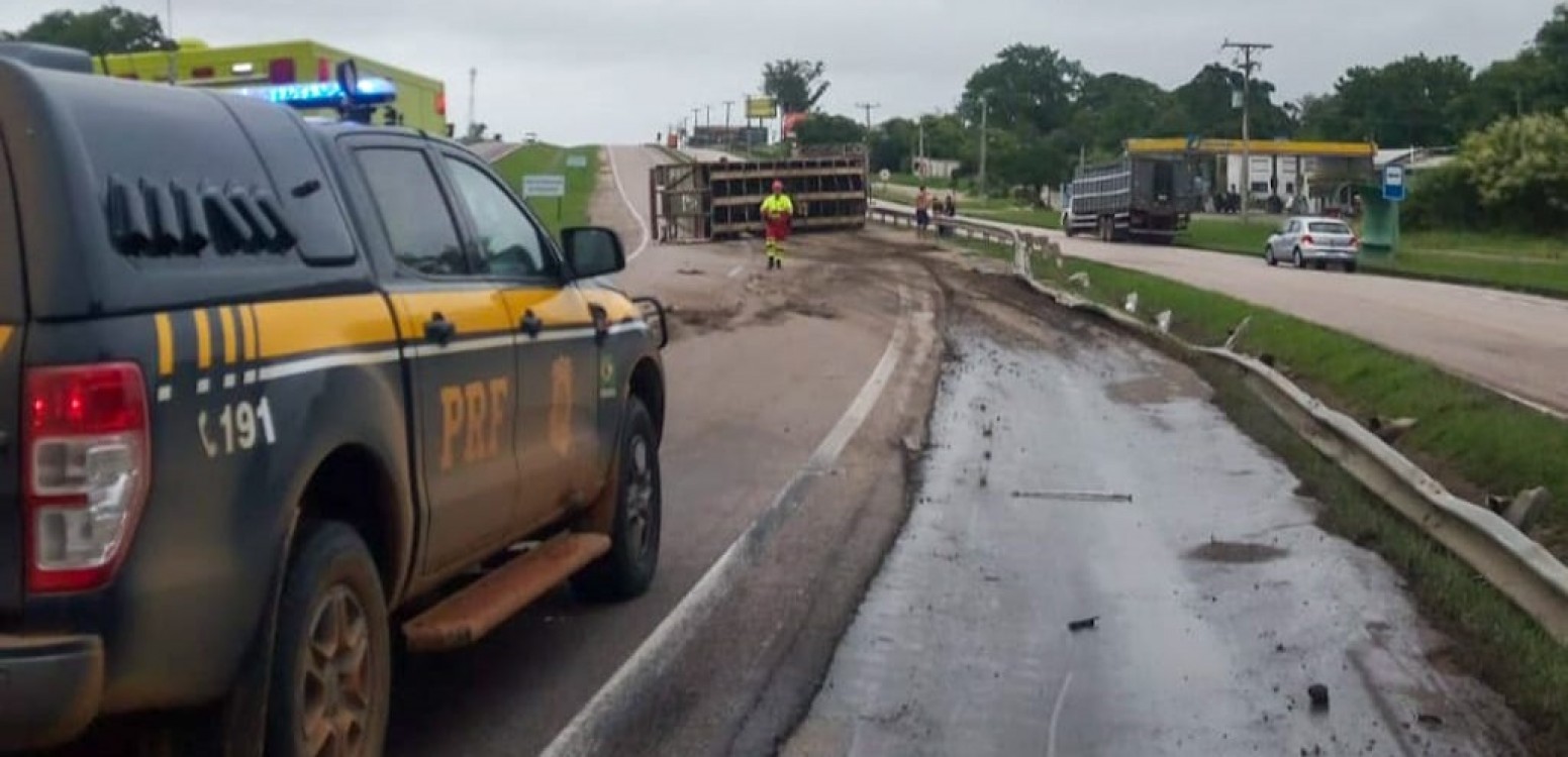 CAMINHÃO BOIADEIRO TOMBA E BLOQUEIA UM DOS SENTIDOS DA BR 116, EM PELOTAS