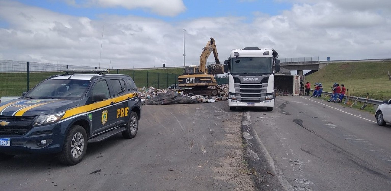 Uma equipe da Polícia Rodoviária Federal (PRF) está fazendo o atendimento da ocorrência e alertou que os veículos de passeio estão sendo desviados. O motorista do veículo não ficou ferido e neste momento as equipes trabalham na limpeza da pista para a remoção do caminhão e posterior liberação do fluxo.