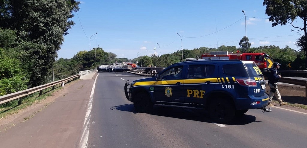 Um grave acidente, no final da manhã deste sábado, está mobilizando equipes da Polícia Rodoviária Federal (PRF), do Corpo de Bombeiros e da CCR Via Sul, na BR 386, em Estrela, no Vale do Taquari. Um caminhão tanque carregado com combustível tombou na altura do km 350, em cima da ponte sobre o arroio Boa Vista, e explodiu.