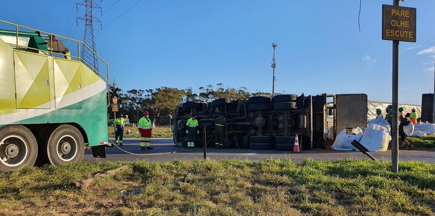 • O condutor do caminhão foi atendido pela equipe de resgate da Ecosul e foi liberado. Posteriormente, ele acabou sendo encaminhado ao hospital por familiares, depois de reclamar de dores na cabeça. Foto: Rodrigo de Aguiar/Papareia News
