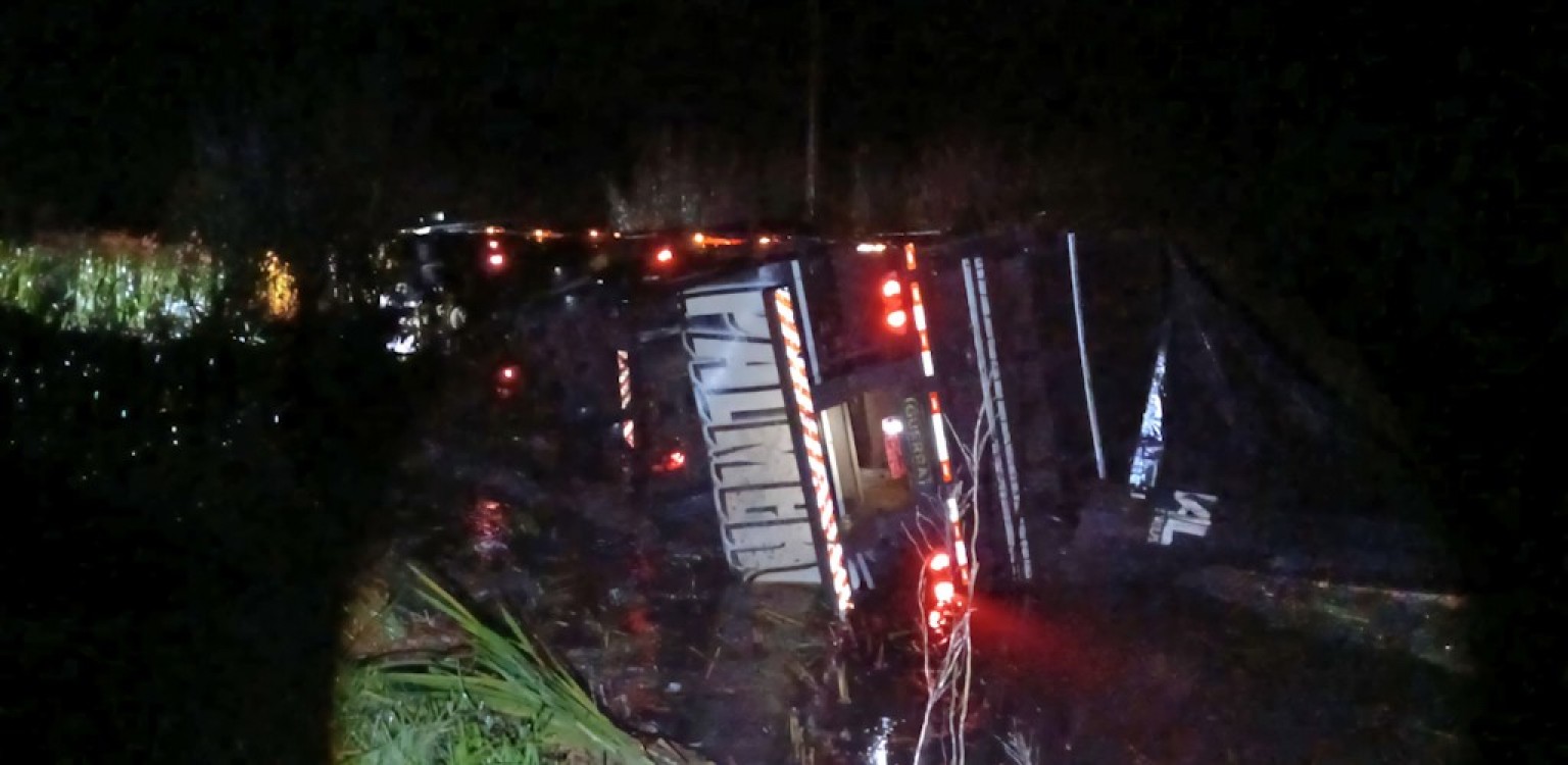 Uma saída de pista seguida de tombamento de uma carreta foi registrada na noite desta segunda-feira (7), na BR 392, em Rio Grande. O acidente aconteceu na altura do km 50, nas proximidades da praça de pedágio do Capão Seco.