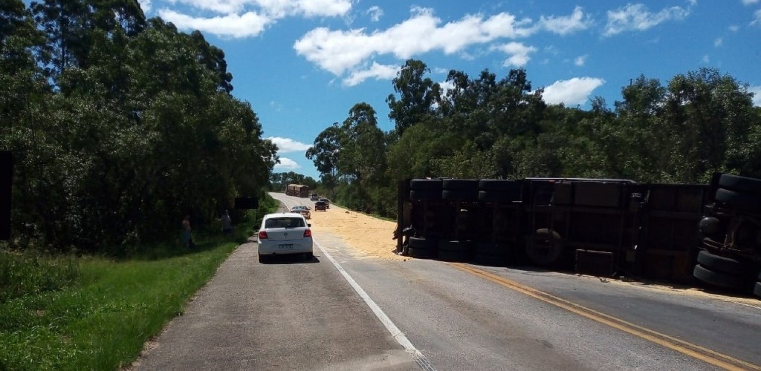 O tráfego de veículos está fluindo pelo acostamento e os motoristas precisam ter atenção. A Polícia Rodoviária Federal (PRF) também está com uma equipe fazendo o atendimento da ocorrência e confirmou apenas a existência de danos materiais. Parte da carga de soja ficou espalhada sobre a pista.