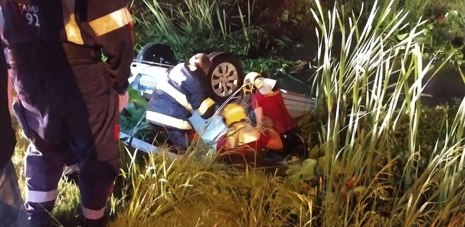 O Corpo de Bombeiros foi acionado pelo Serviço de Atendimento Móvel de Urgência (SAMU) que encontrou dificuldades para retirar as vítimas do interior do automóvel, pois o veículo havia capotado e estava com as quatro rodas e o tanque para cima. A ocorrência se tornou ainda mais complexa, porque no local havia correnteza em razão da água da chuva que começava a escoar.
