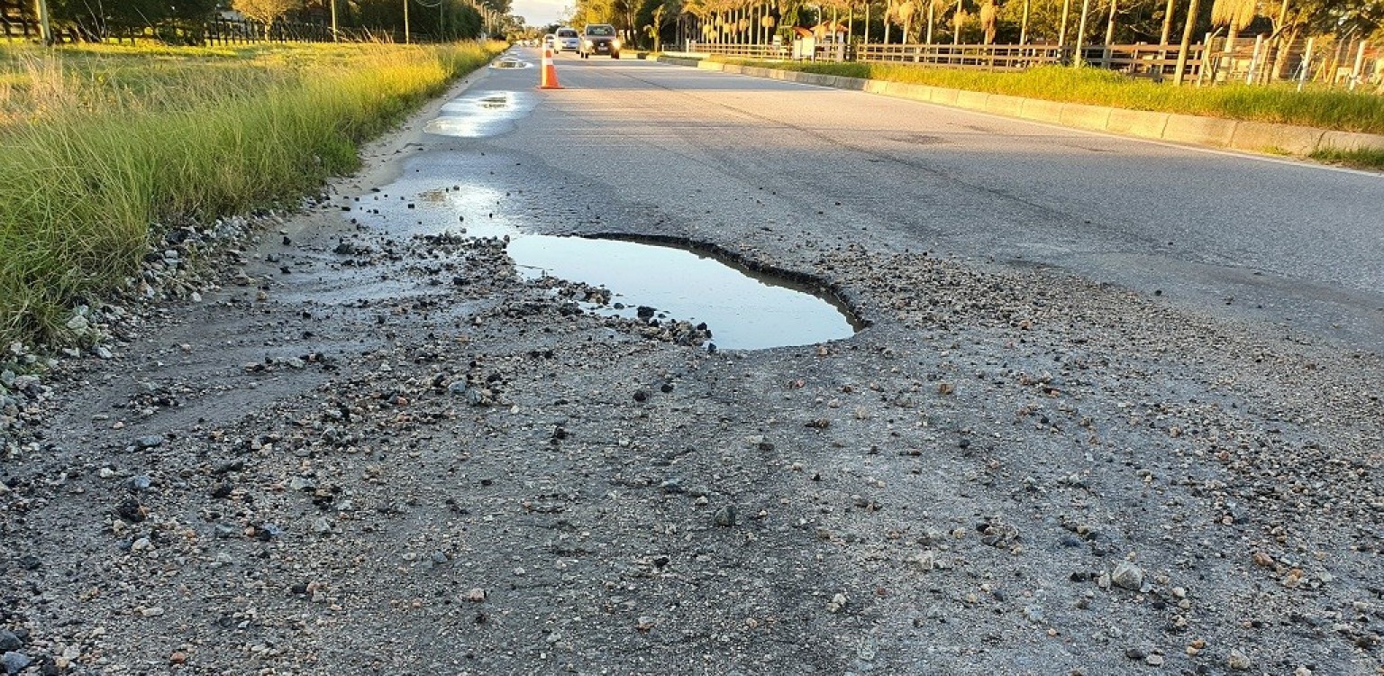 Motoristas que seguem no sentido Cassino - Rio Grande pela ERS 734 precisam ficar atentos para a existência de um enorme buraco sobre a pista da direita. O desnível que, dependendo do ponto de vista, pode ser chamado de cratera, está localizado na altura do km 3, em frente ao Haras Potra Morena, no Senandes.