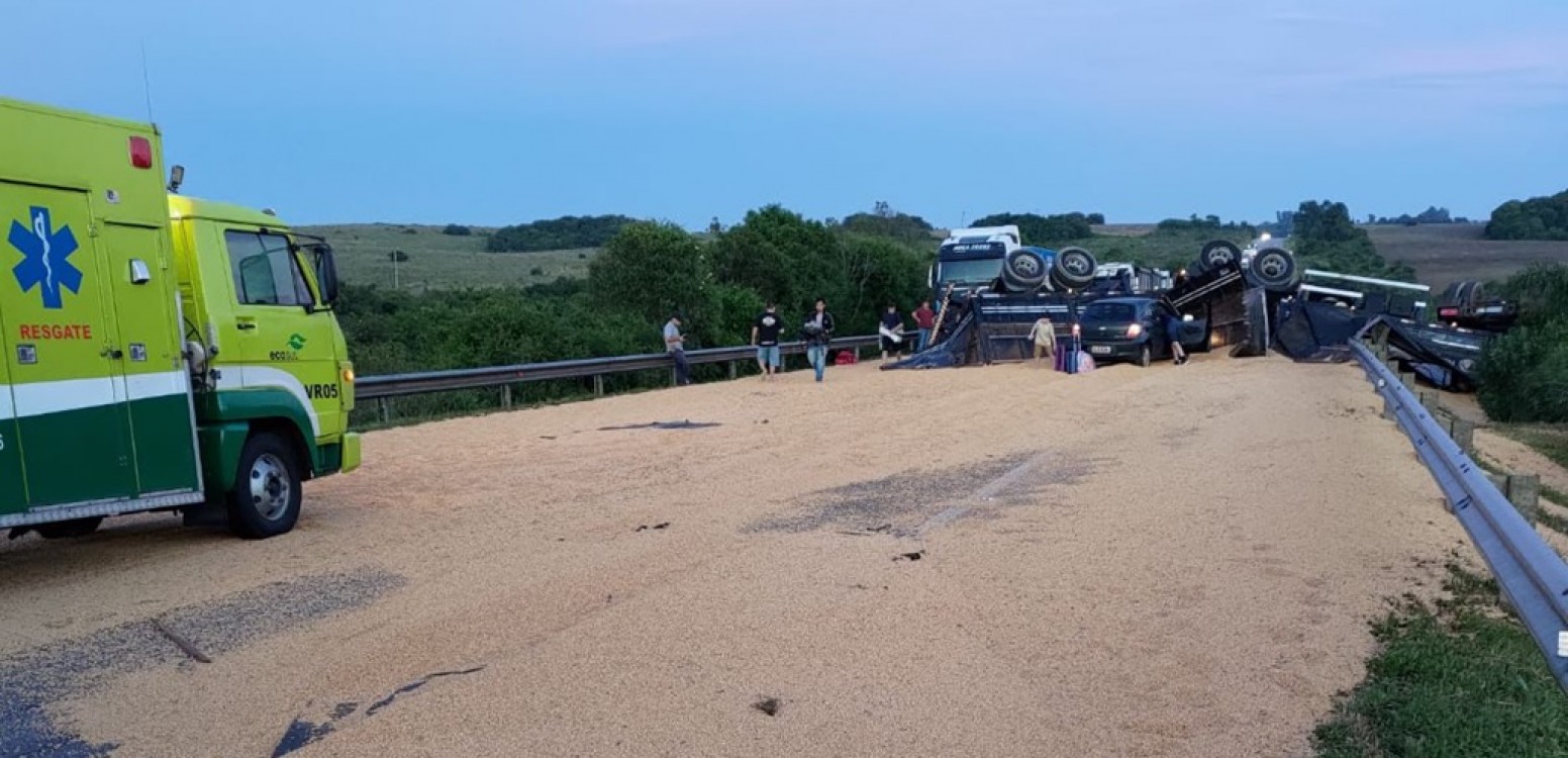 De acordo com a Ecosul, concessionária que administra a rodovia, a Fiat Strada colidiu frontalmente com a carreta que tombou e derramou a carga de soja sobre a pista. Com isso, o condutor do Chevrolet Agile perdeu o controle do automóvel e colidiu contra a carroceria do caminhão.