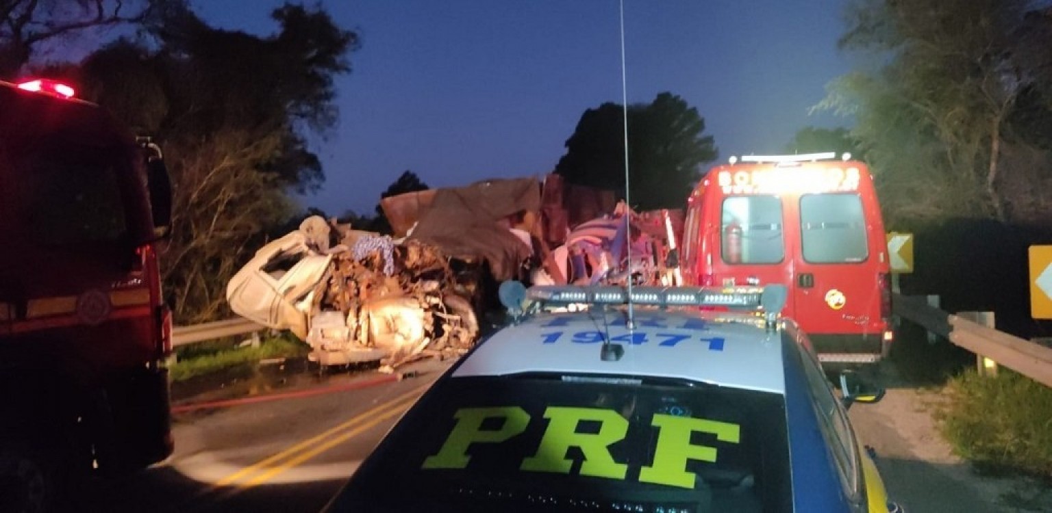 Ainda não há detalhes sobre o que causou o acidente e nem mesmo se as vítimas fatais estavam no mesmo veículo ou se foram os motoristas dos dois caminhões. Foto: Divulgação/PRF