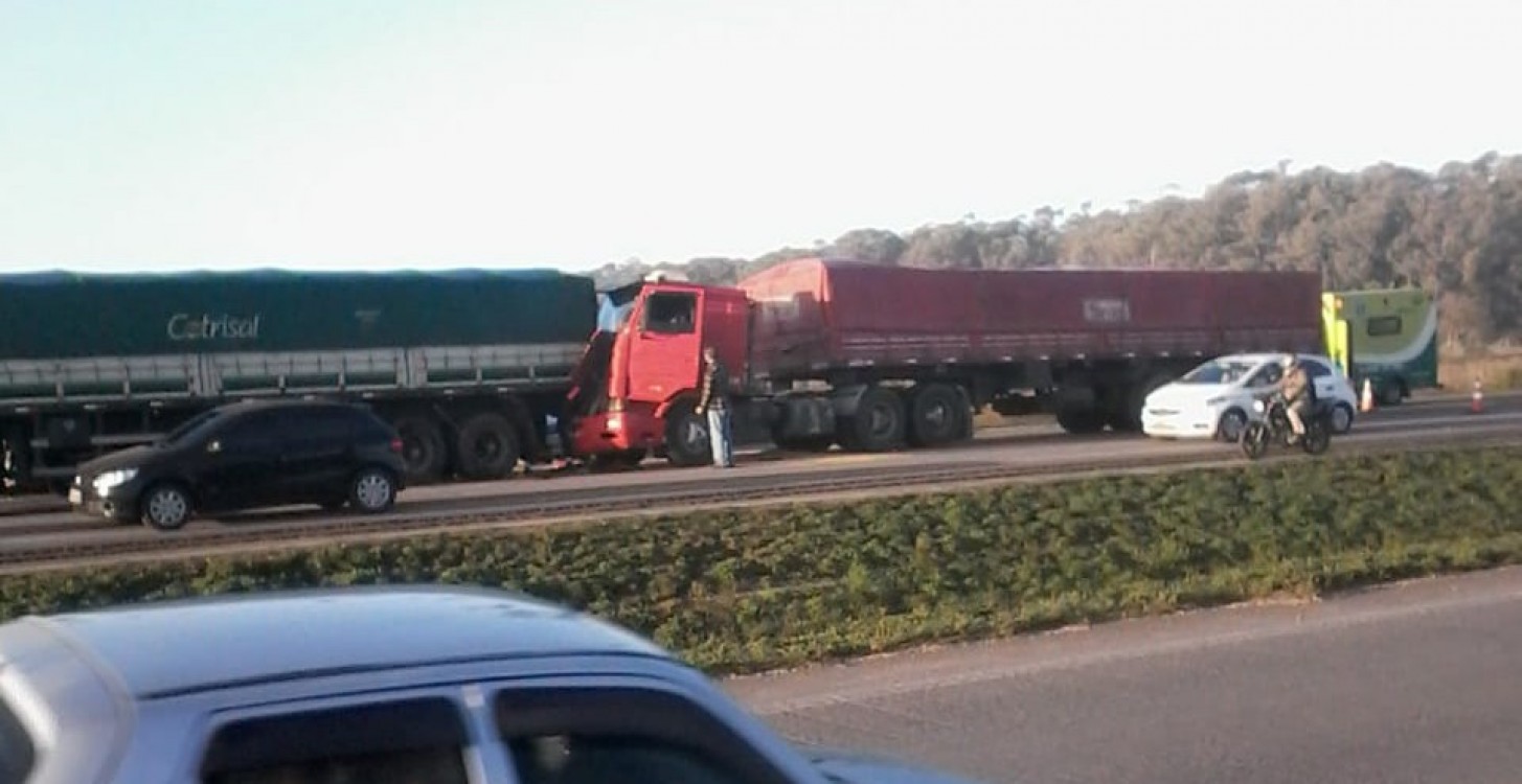 Os condutores da moto e de um dos caminhões foram encaminhados ao Pronto Socorro do Hospital Santa Casa por equipes de resgate da Ecosul com escoriações leves. Foto: Divulgação/Redes sociais