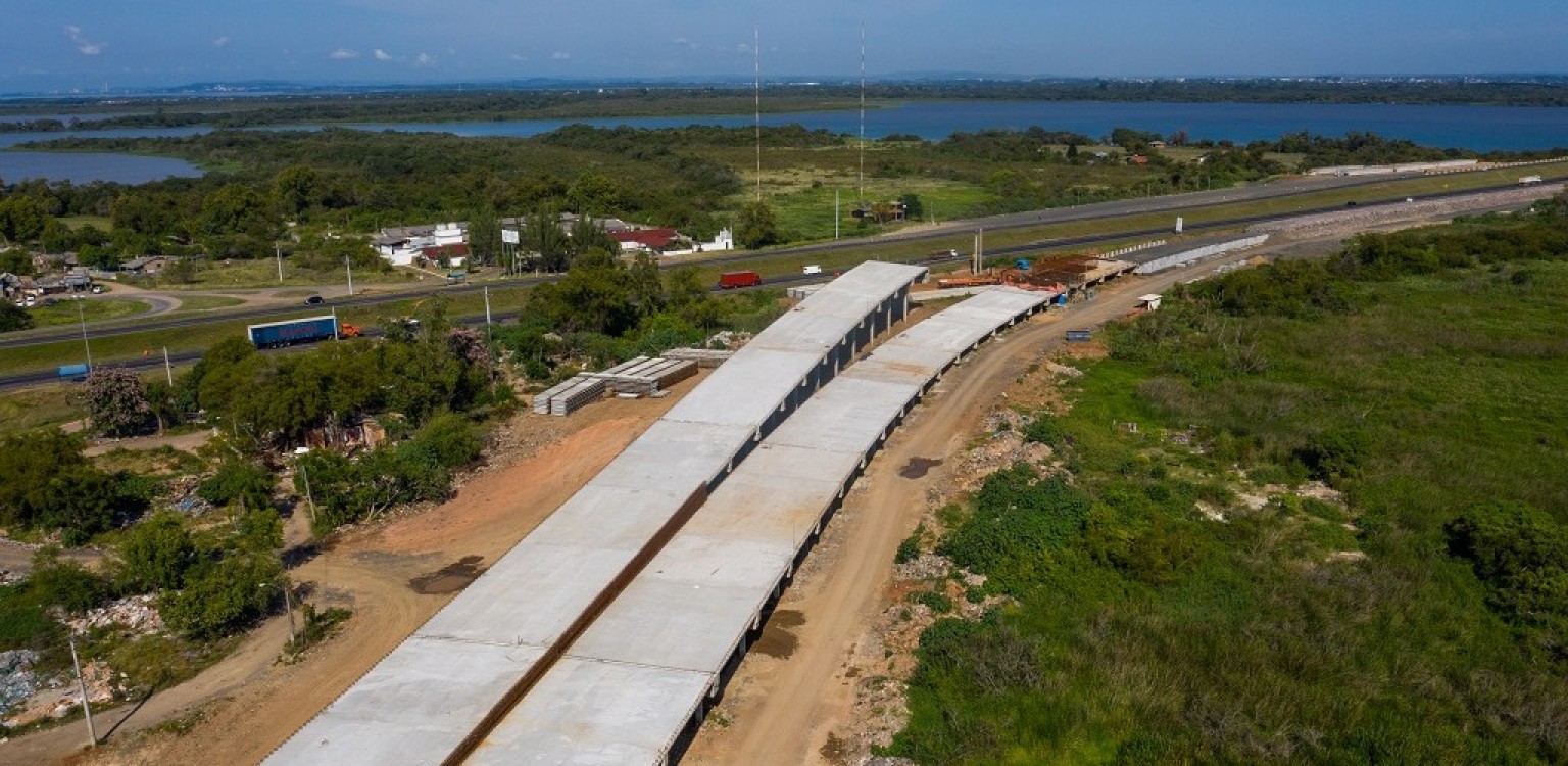 As interrupções acontecem no km 99 e entre os km 100 e km 102. Os trabalhos entraram em um ritmo acelerado para que a travessia principal da estrutura seja liberada ao tráfego em novembro. Foto: Divulgação/Consórcio Ponte do Guaíba