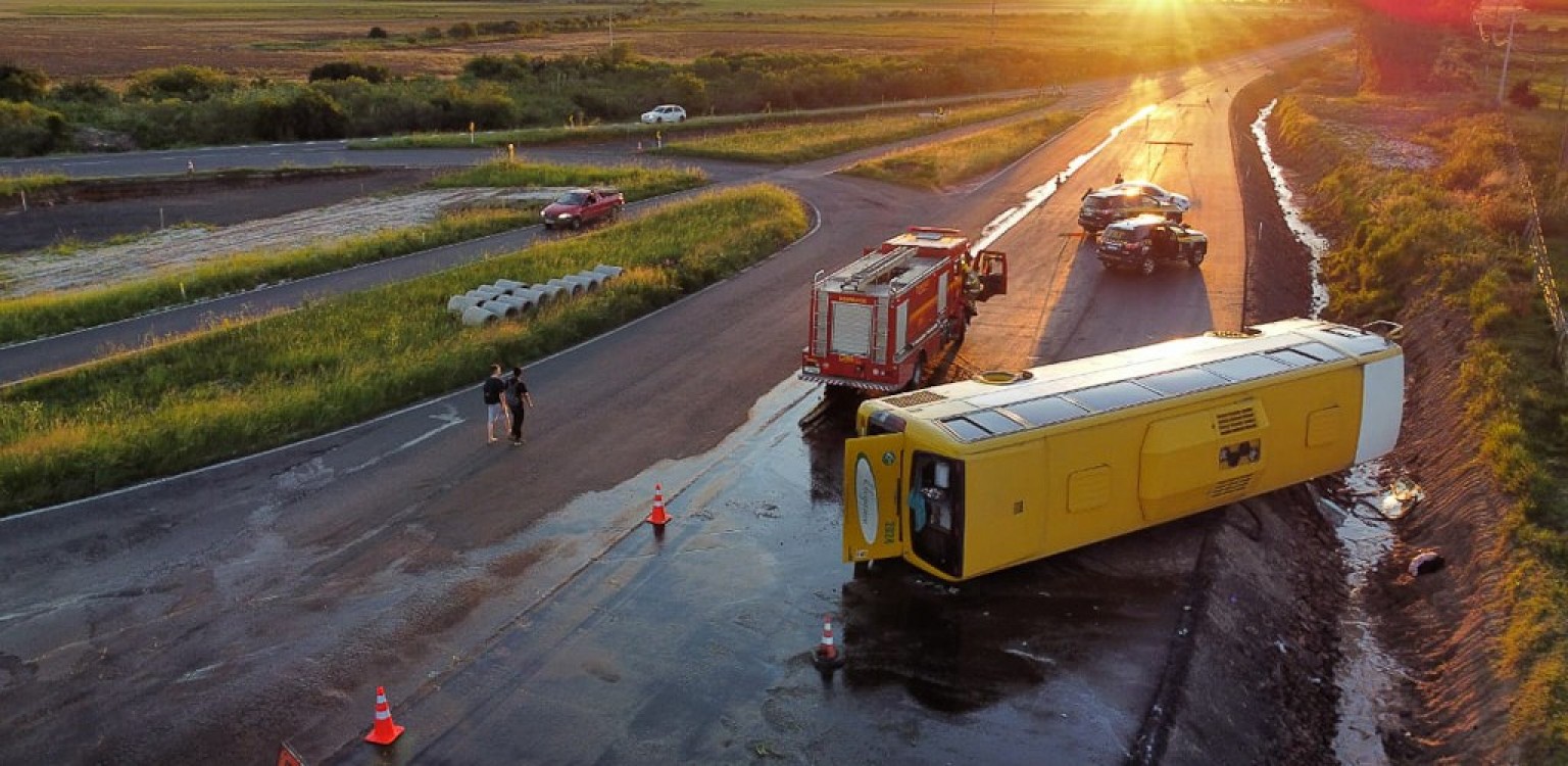 ÔNIBUS QUE SAIU DE RG COM DESTINO À URUGUAIANA TOMBA NA BR 158, EM SANTANA DO LIVRAMENTO