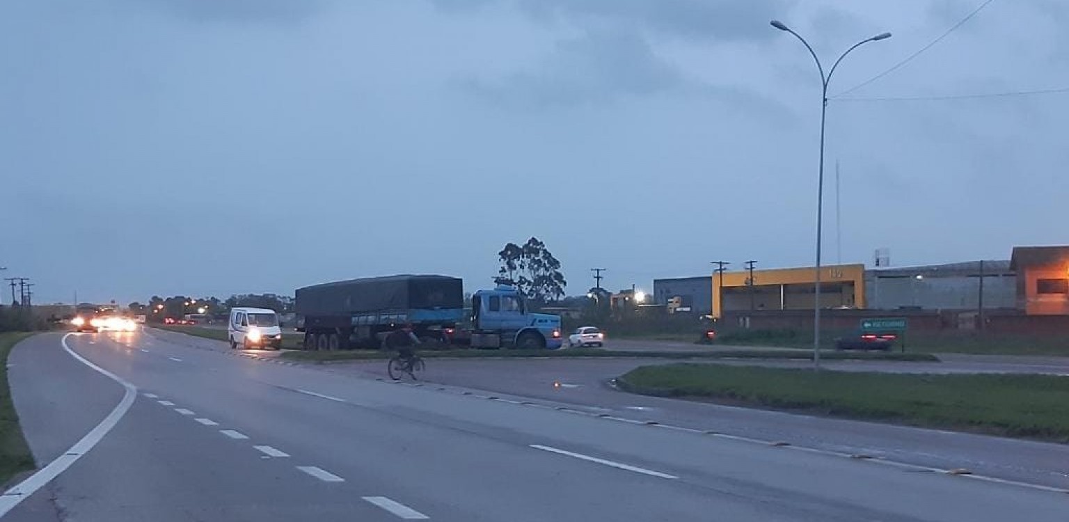 Uma saída de pista, no final da tarde desta sexta-feira, traz transtornos para quem precisa fazer o retorno próximo ao acesso do bairro Carreiros, na BR 392. Apenas o cavalo mecânico foi parar sobre o canteiro central, mas a carreta ocupa parte do recuo.