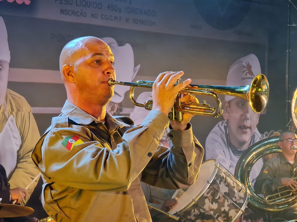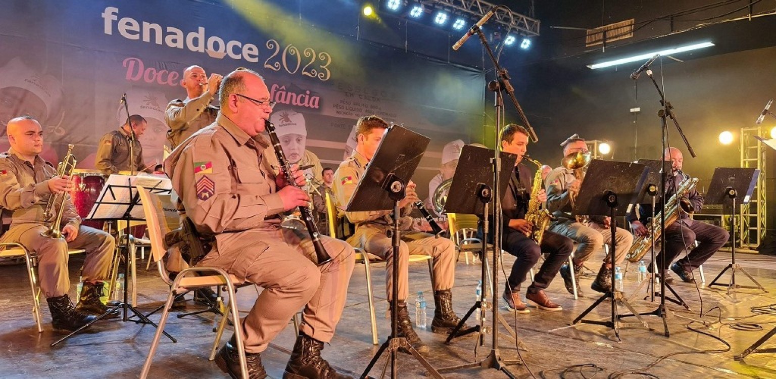 De canções militares a sucessos românticos e clássicos do pop rock nacional: assim foi o repertório da apresentação da banda do Comando Regional de Polícia Ostensiva Sul (CRPOSul), realizada na praça de alimentação da Fenadoce, na tarde do último sábado (10). Além da participação no evento, os policiais também percorrem as cidades da área de atuação do comando, levando música e diversão às comunidades.