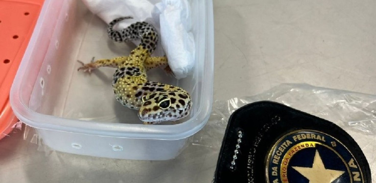 Agentes da Receita Federal do Chuí localizaram, na manhã desta terça-feira (11), um lagarto da espécie Gecko Leopardo sendo transportado em um ônibus da linha Porto Alegre - Chuí. O animal, cuja espécie exótica tem introdução e criação proibida no Brasil, estava declarado como peça de veículo para tentar despistar a fiscalização.
