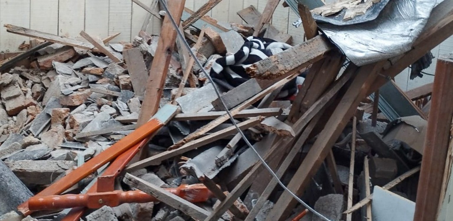 Parte da lateral da parede de um sobrado acabou caindo sobre o telhado da residência, atingindo a vítima que estava no quarto. Foto: Fernando Bizzarro/Defesa Civil